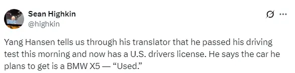 恭喜!杨瀚森正式获得美国驾照 自曝人生第一辆车计划买二手宝马X5